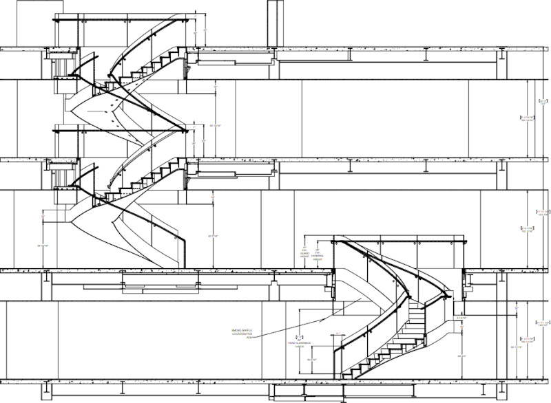 Three story feature stair for an international law firm with a curved glass guardrail.