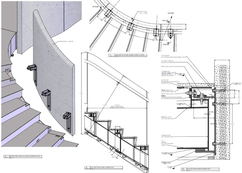 Feature stair for an international law firm with a massive solid stone guardrail and intergrated lighting.